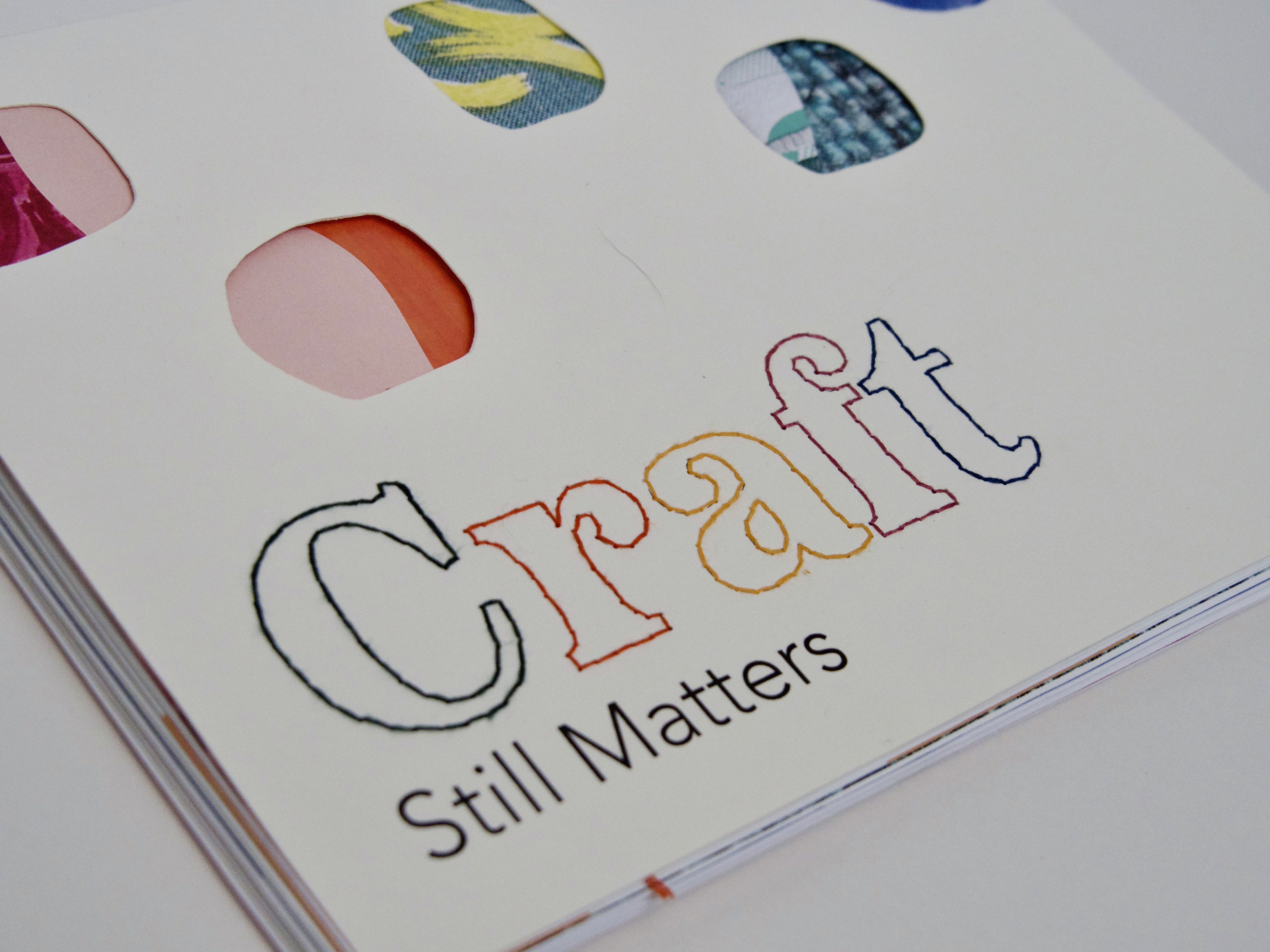 This exhibition catalog highlights modern designers who incorporate traditional crafts into or draw inspiration from their artistic practice. The cover is hand-bound, with hand-embroidered typography, merging both design and craft in the creative process of making the physical object.