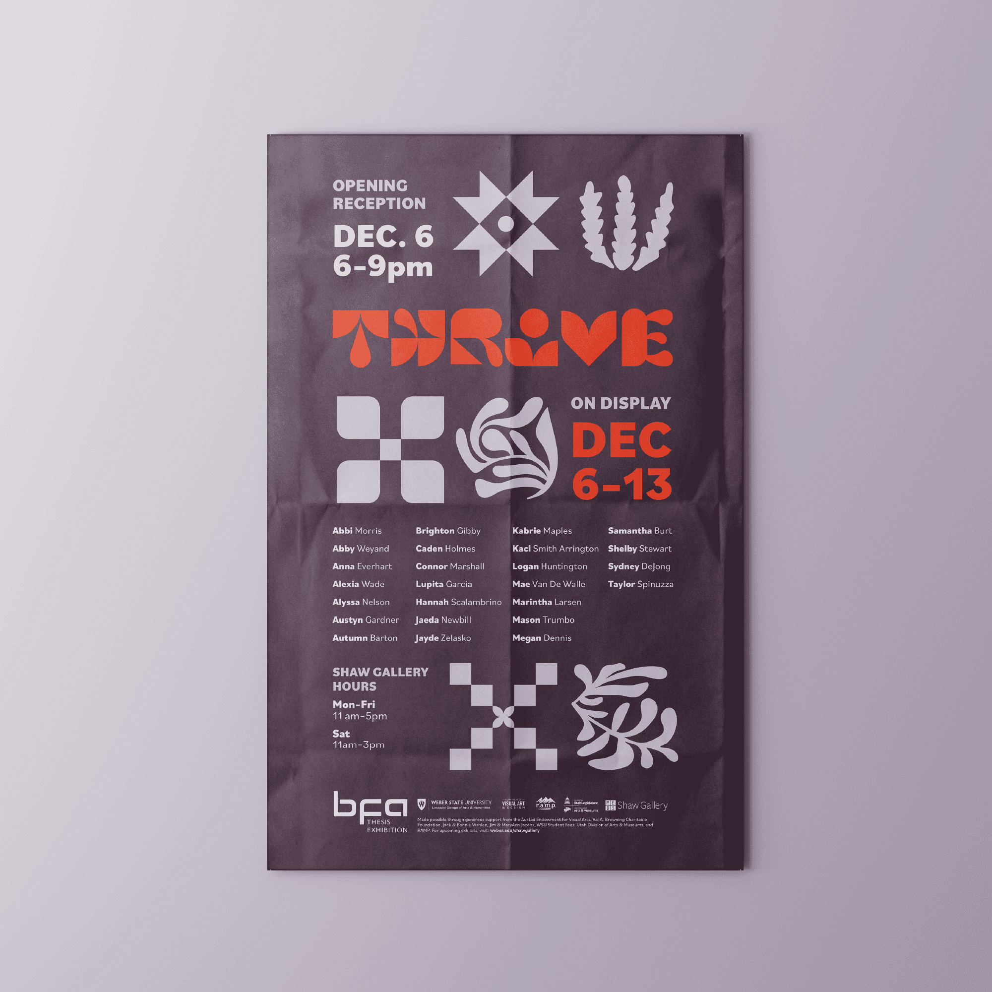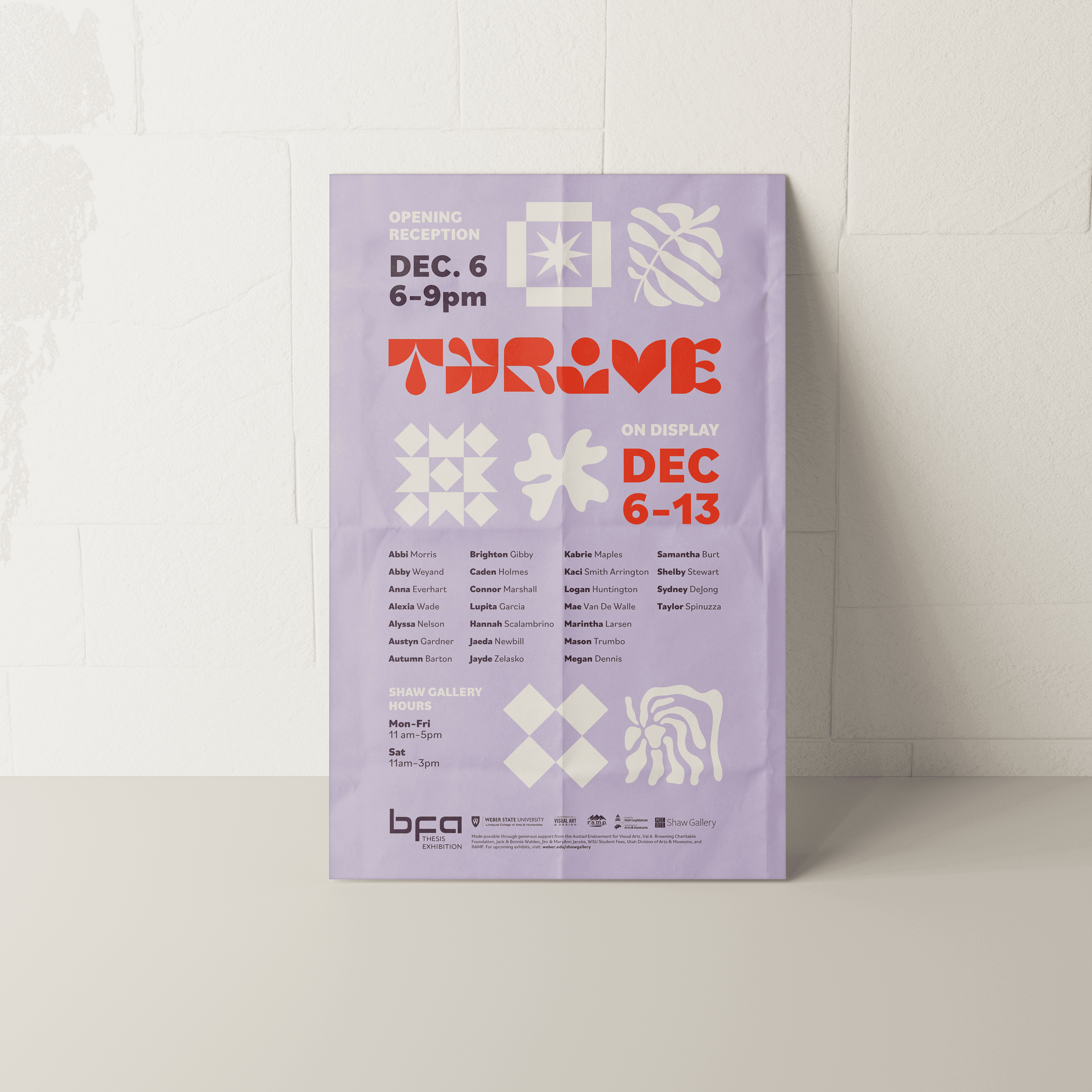 As part of Weber State University’s AIGA club, my team and I developed the branding for the Fall 2024 degree show, drawing from traditional quilting and mosaic elements to craft a design that’s both structured and organic.